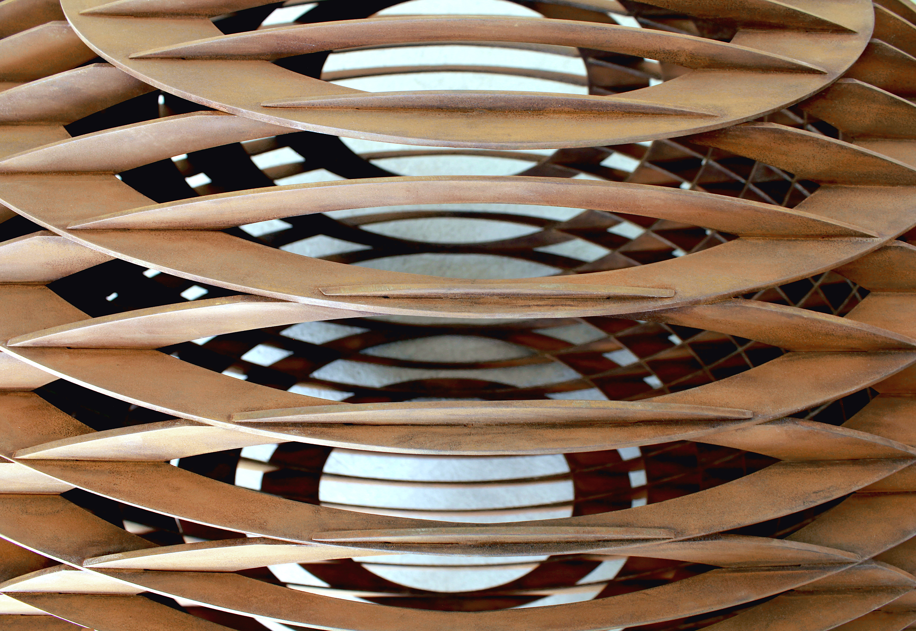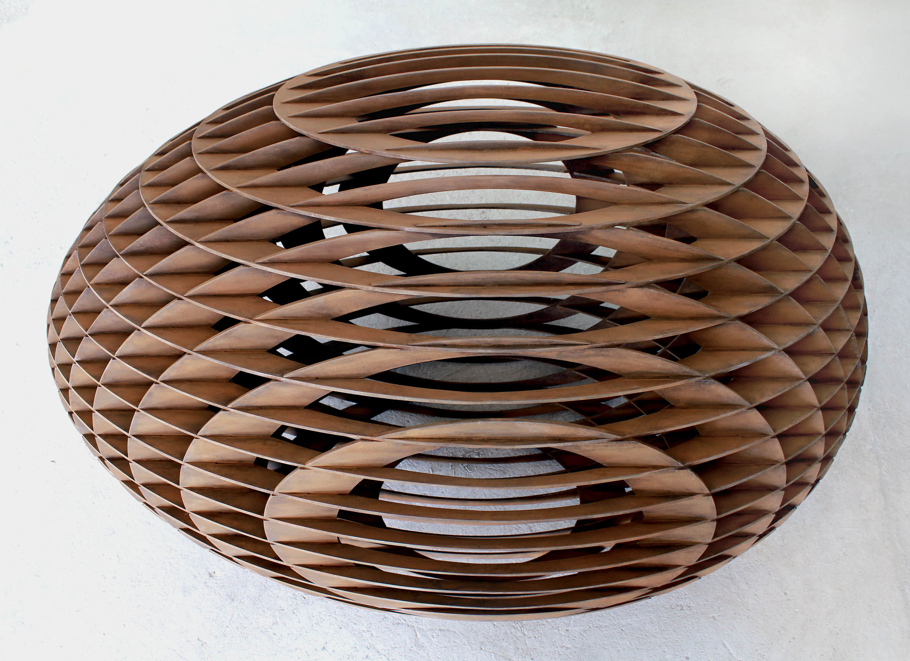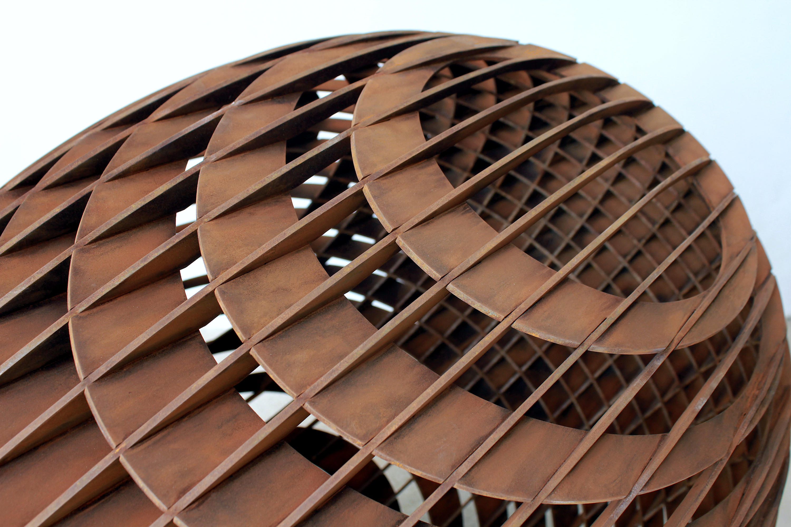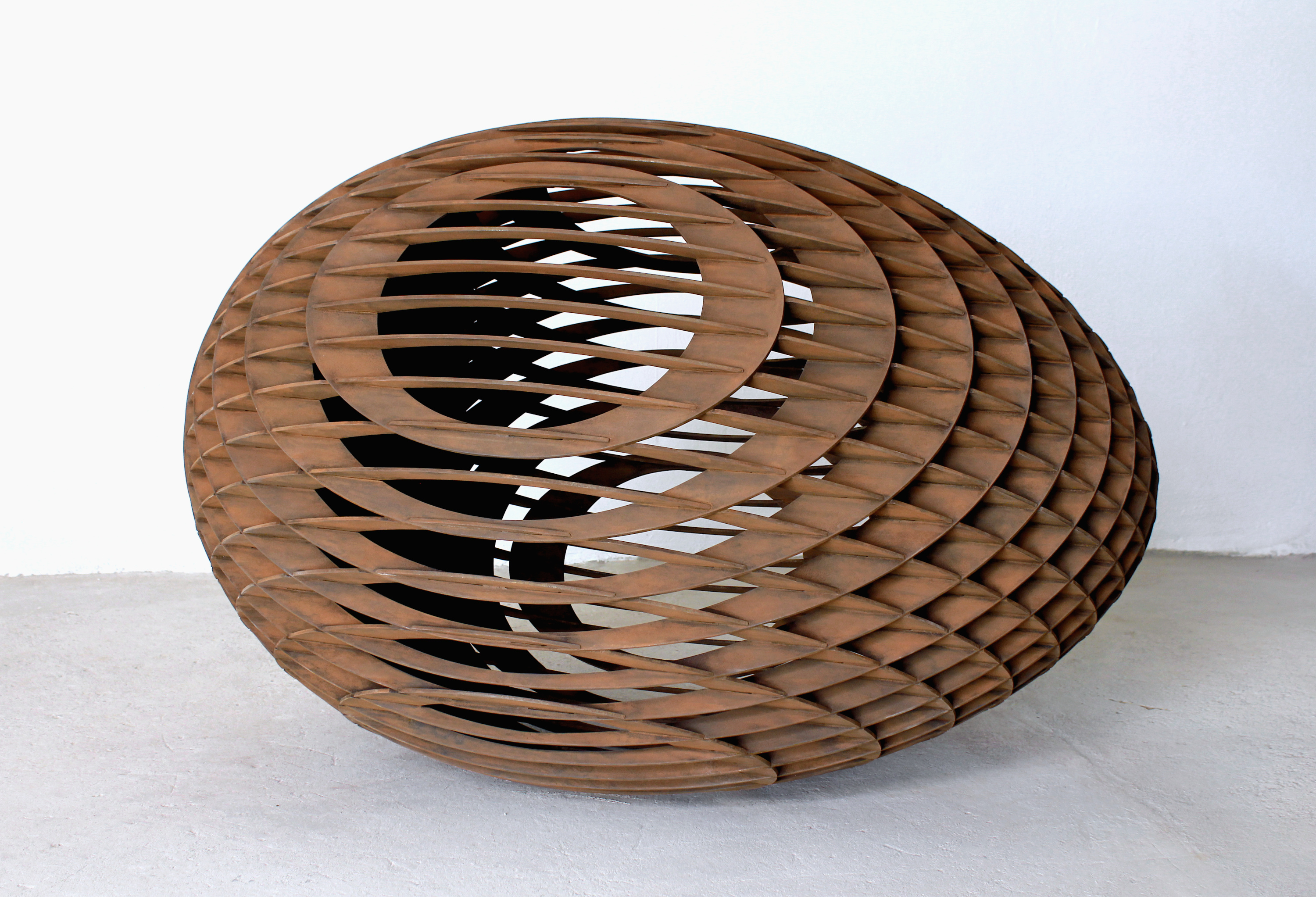The work was developed using a self-written algorithm in the 3D programme Grasshopper/Rhino. The individual sheet metal parts were then cut to size and the connecting slots individually filed to size to achieve the best possible fit. The individual oval halves were then welded together and sanded. However, all the joints between the layers of sheet metal are only interlocked, not welded, so that the structure holds itself together in the end. The surface was then oxidised and lightly sanded.