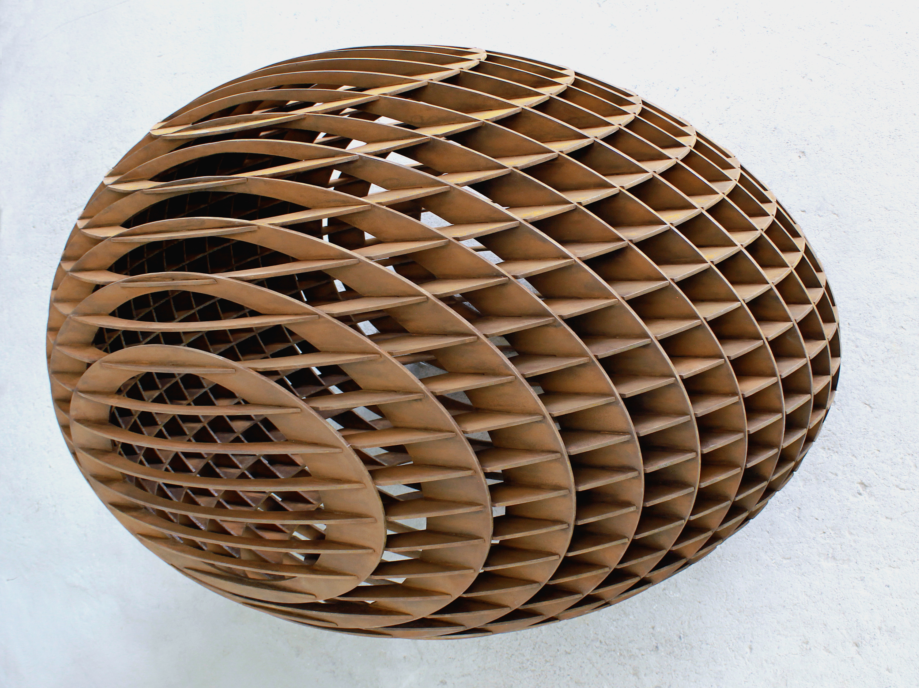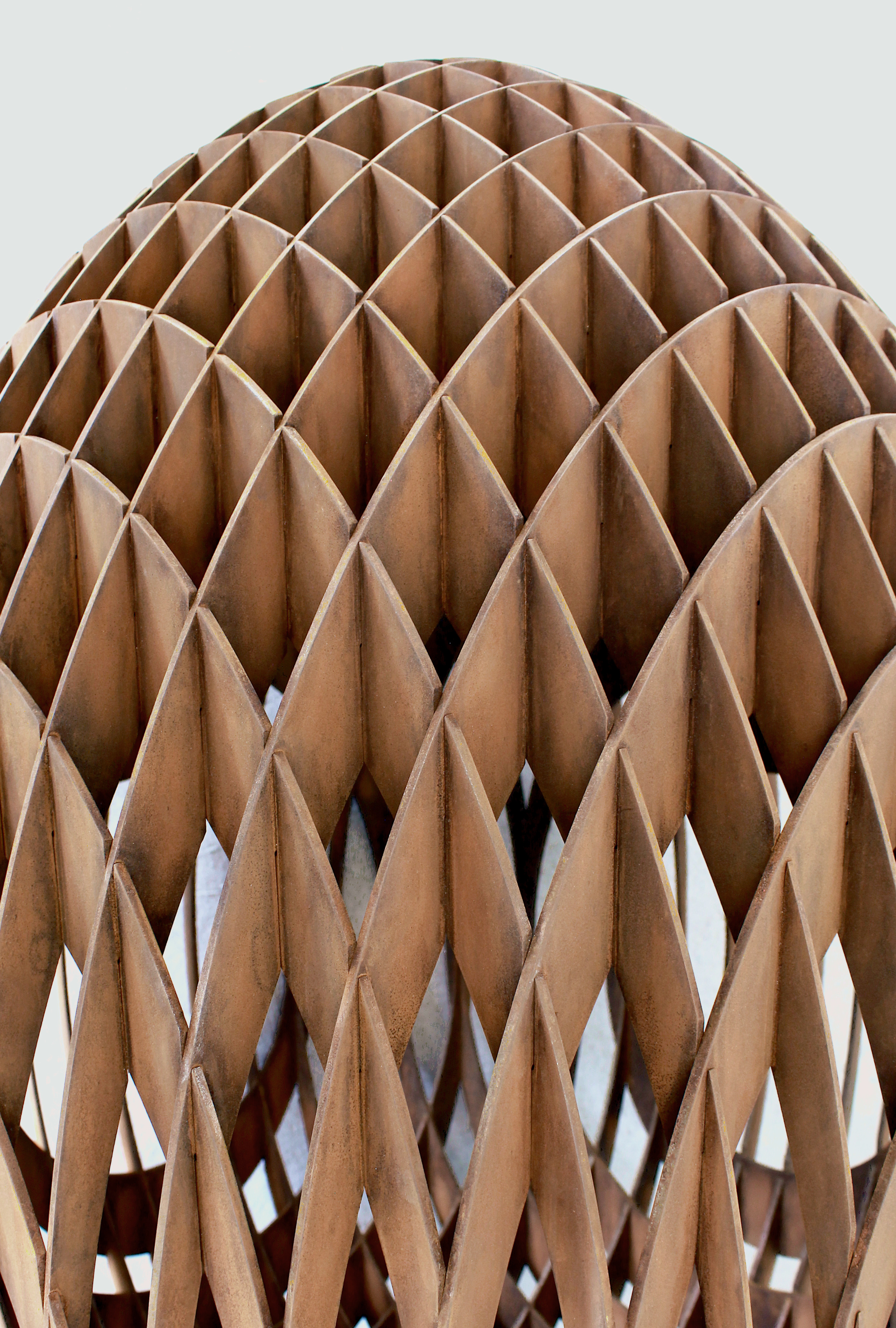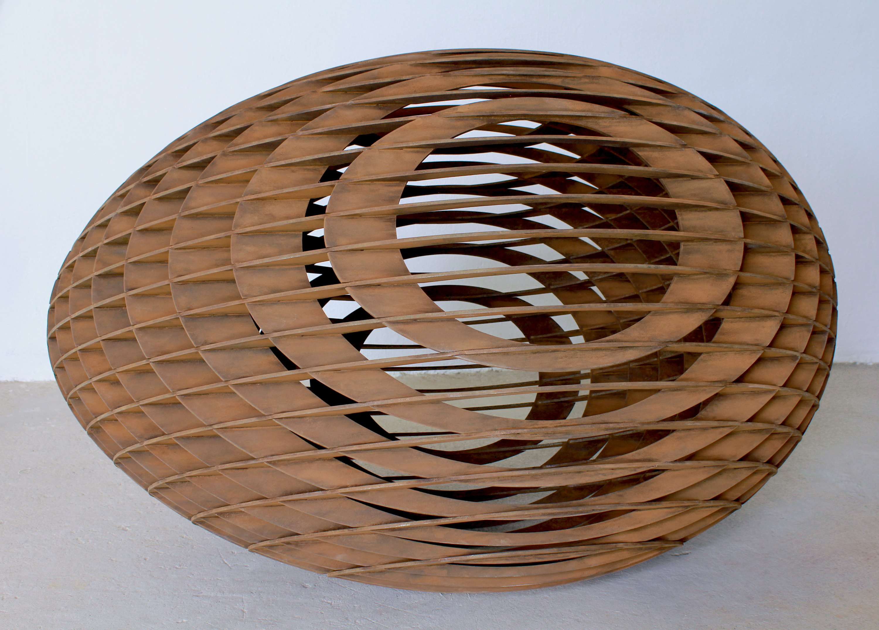 'Huevo' creates a field of tension between opposites. On the one hand, the perfectly harmonious egg shape, based on the mathematical equation of the egg; on the other, the complex, technical, interlocking structure of 36 oval steel sheets. Tranquillity, fragility, security and the origin of life are juxtaposed with a massive, unsettling construction reminiscent of a medieval cage from which there is no escape.
