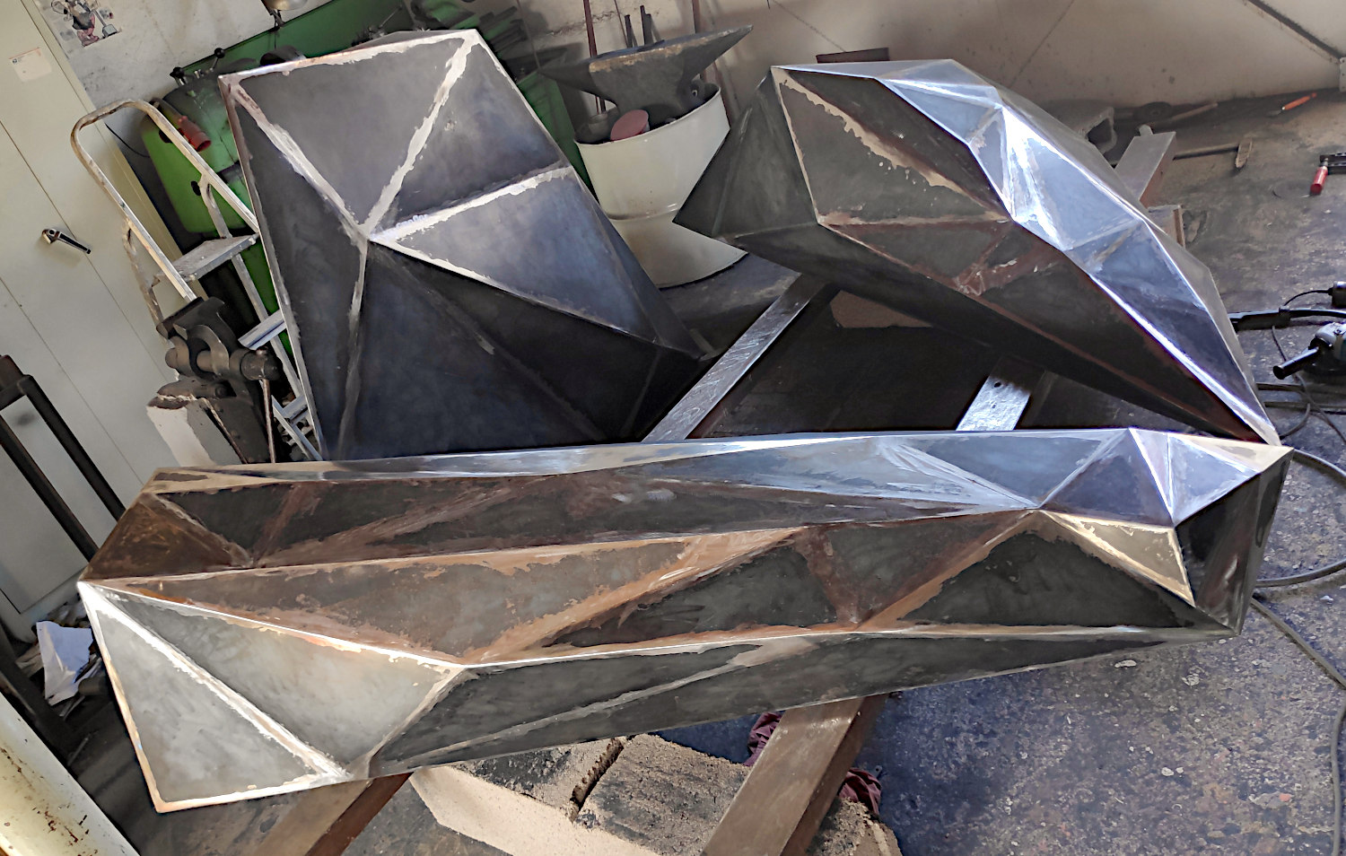 Phantasmata consists of three metal sculptures with faceted surfaces and a textured satin-black finish. Their irregular geometry, inspired by stealth technology, makes them appear to evade the gaze—blurring their contours as they interact with light and their surroundings.