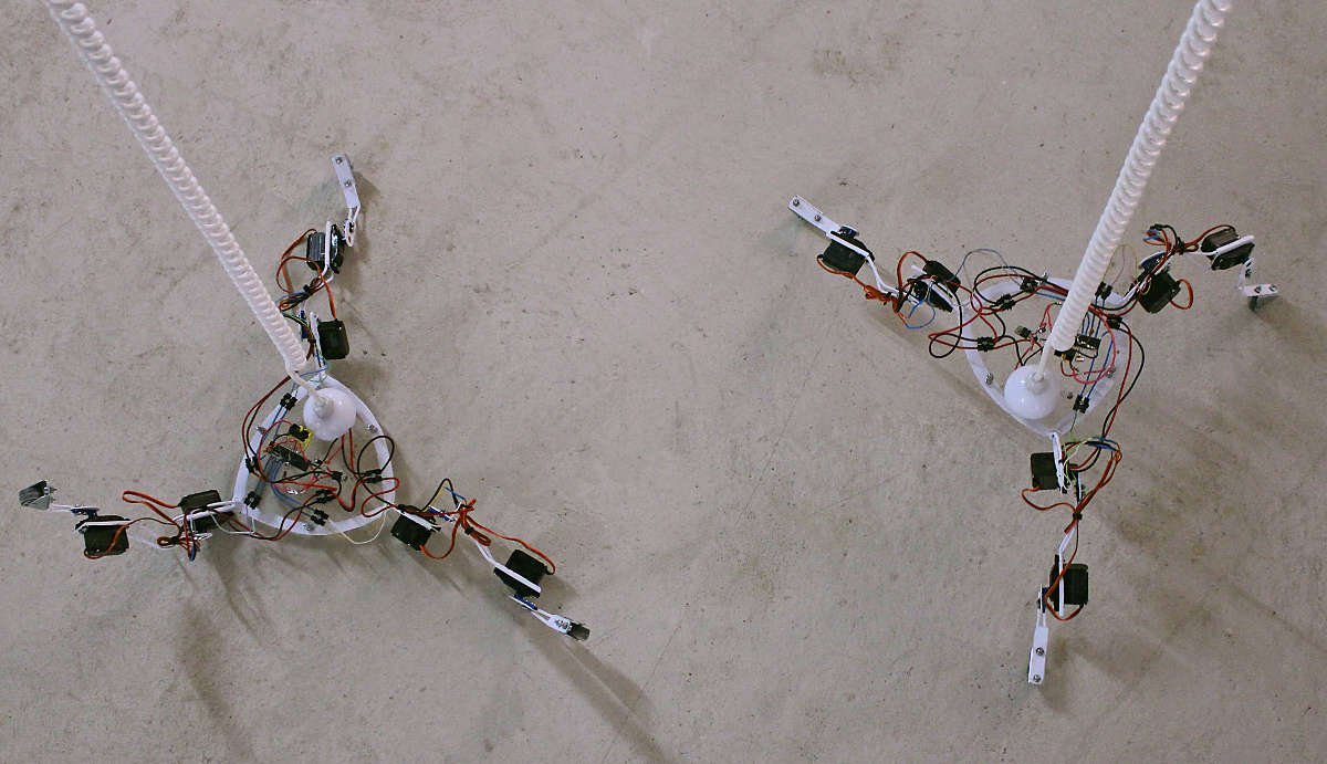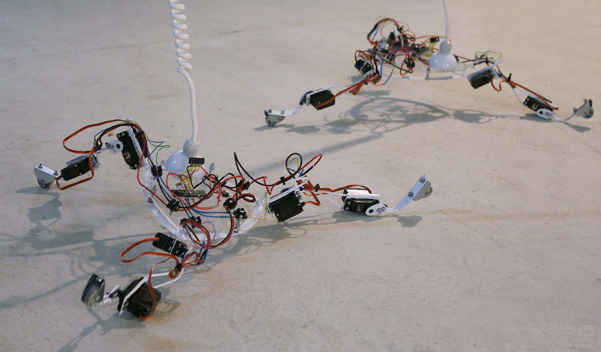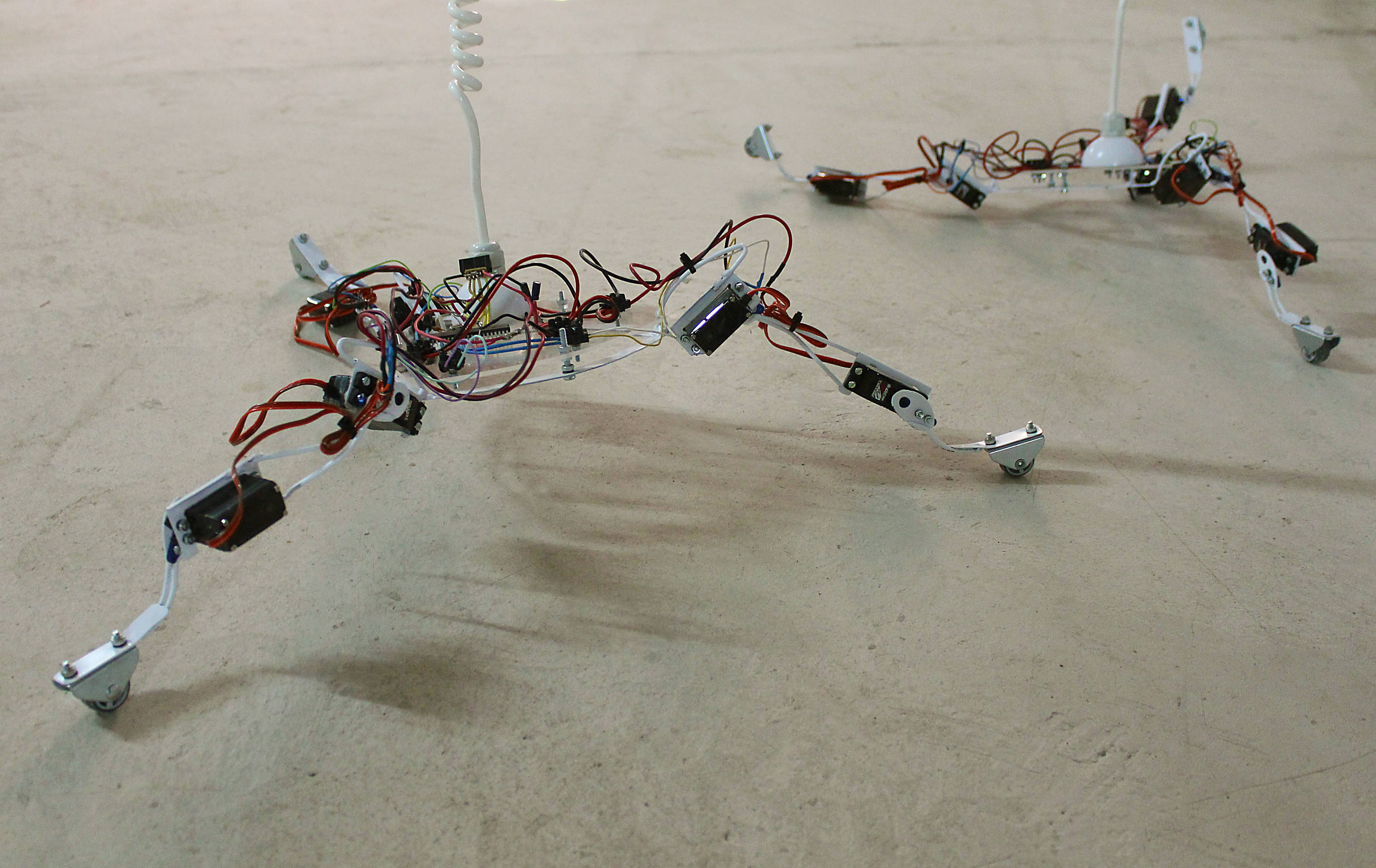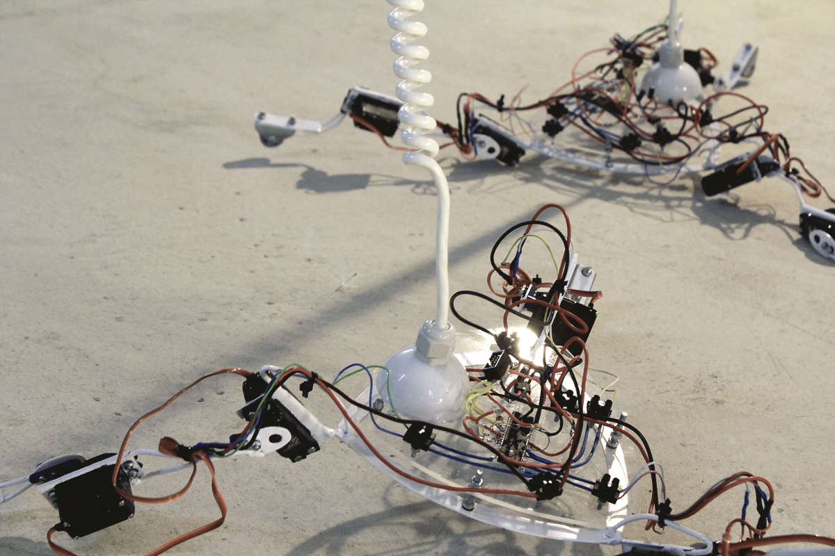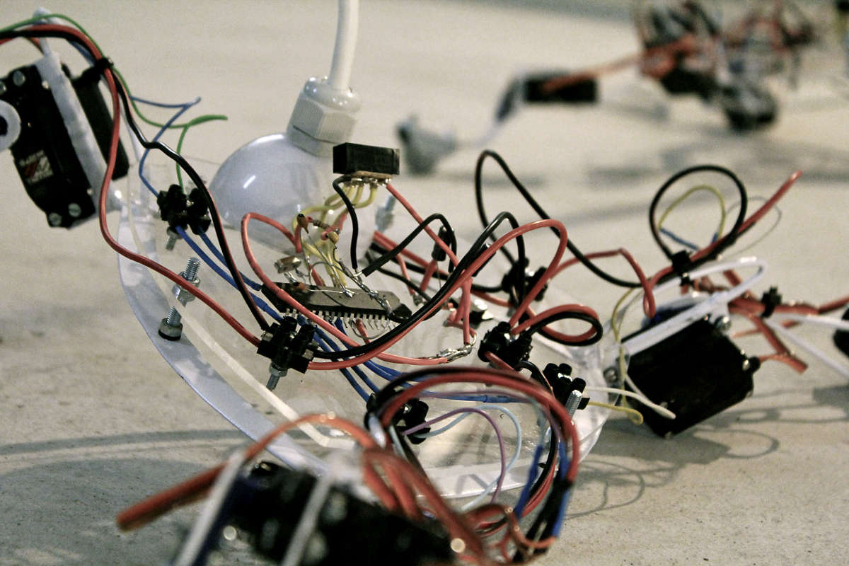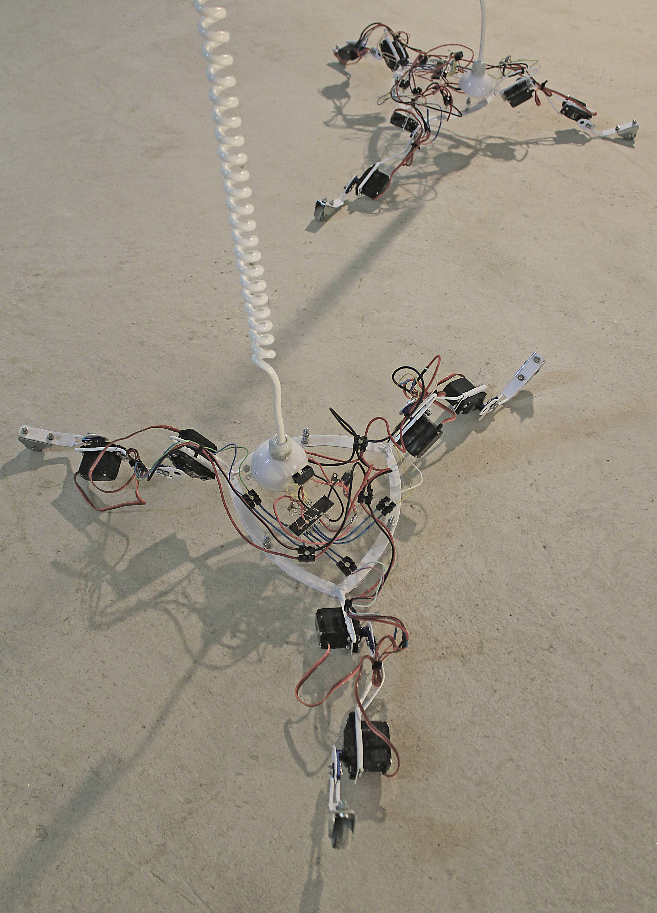 Los moribundos (the moribunds) is an installation with two insect-likes tripods doing uncontrolled movements. Each of the three legs is connected to two servo motors that make random movements with regard to it absolute position as well as to its velocity. The “brain” of the moribundos is an Atmega16 Microcontroller that is welded without any printed circuit board directly with wires and fixed on the center Plexiglas plate. The moribundos are connected with a white spiral-shaped cable up from the roof.