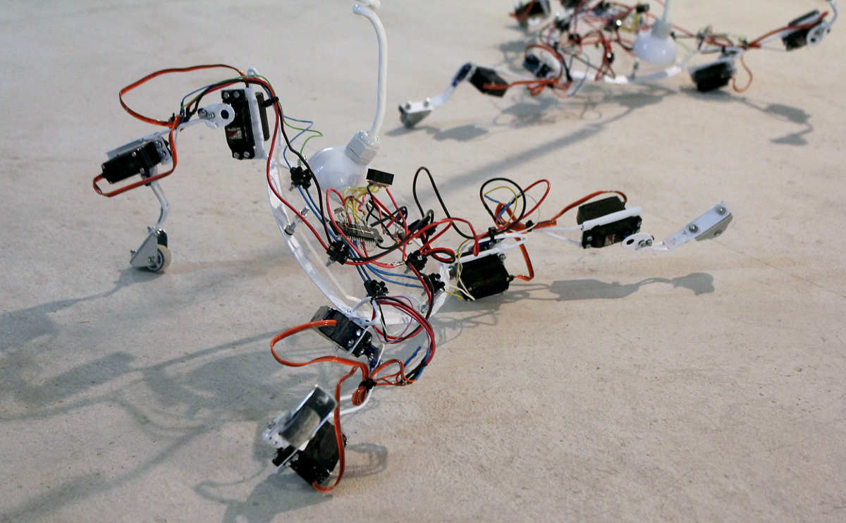 The work undermines the expectations of the visitor observing some regularly working robots. In this case, the robots are moribund like animals in an experimental laboratory, unable to escape or control their movements. Connected to an umbilical cord, the creatures only show some poor death throes and perhaps provoke an uneasy feeling for the visitor. However, the installation made with simple materials like servos, cables, metal sheets, wires or castors, has a distinctive Do-It-Yourself character and mock at the idea of super-robot omnipotence by presenting rather pitiful creatures.